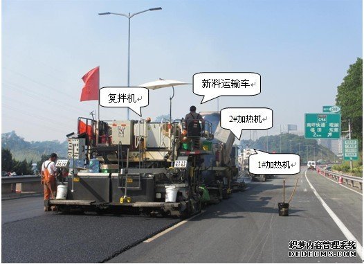 為指導下一步熱再生路面的大面積施工;為確定施工時(shí)的控制數據;為驗證預設的施工組織與施工工藝。廣東能達高等級公路維護有限公司在業(yè)主及監理的監督下,于2012年12月11日在我公司所監理的廣東省開(kāi)陽(yáng)高速K3197+317~K3197+800路段進(jìn)行了瀝青路面就地熱再生試驗路段的施工,該技術(shù)既是目前引進(jìn)的一種先進(jìn)新型技術(shù),也是廣東省高速公路有限公司首次試點(diǎn)的一種施工技術(shù)。經(jīng)原材料抽檢以及前后場(chǎng)施工全過(guò)程旁站、試拌、試鋪、碾壓成型、封閉交通到施工后的檢測與驗收,整個(gè)施工過(guò)程及監理工作的開(kāi)展都進(jìn)行得比較順利,各項技術(shù)指標均能達到規范要求,達到了預期目的。