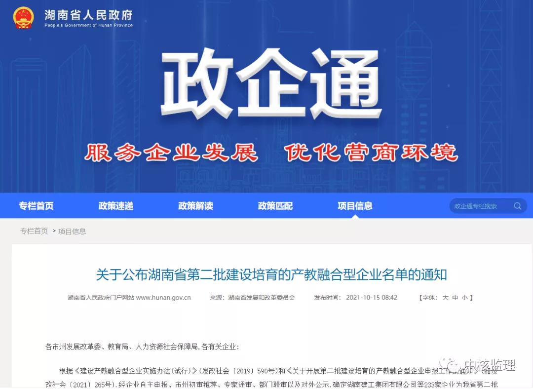 近日,湖南省發(fā)展和改革委員會(huì )、湖南省教育廳、湖南省人力資源和社會(huì )保障廳聯(lián)合發(fā)布文件《關(guān)于公布湖南省第二批建設培育的產(chǎn)教融合型企業(yè)名單的通知》(湘發(fā)改社會(huì )〔2021〕792號),公布了湖南省第二批建設培育的產(chǎn)教融合型企業(yè)名單,長(cháng)沙中核工程監理咨詢(xún)有......[查看詳情]